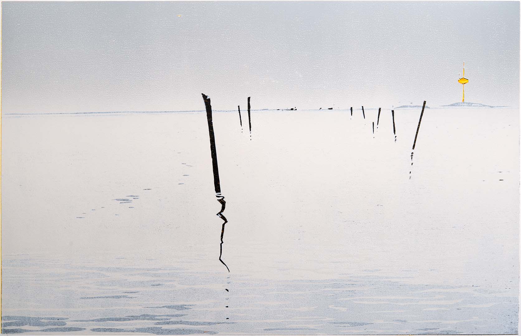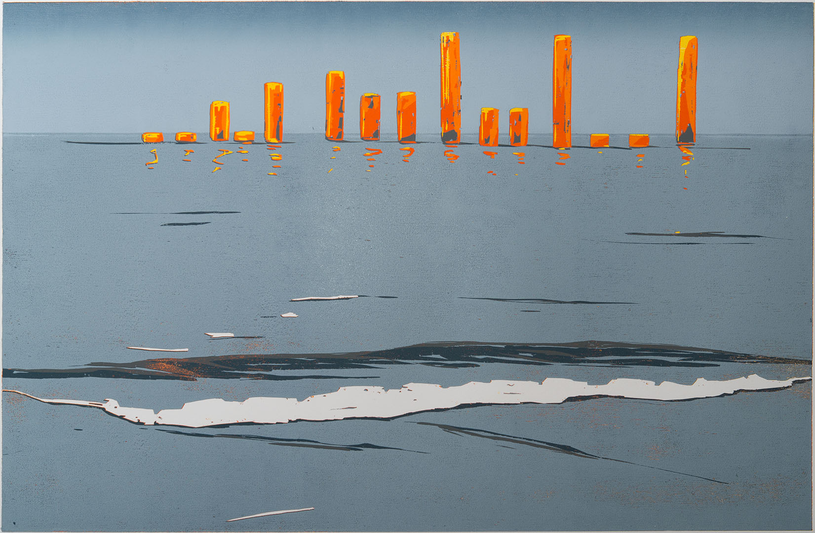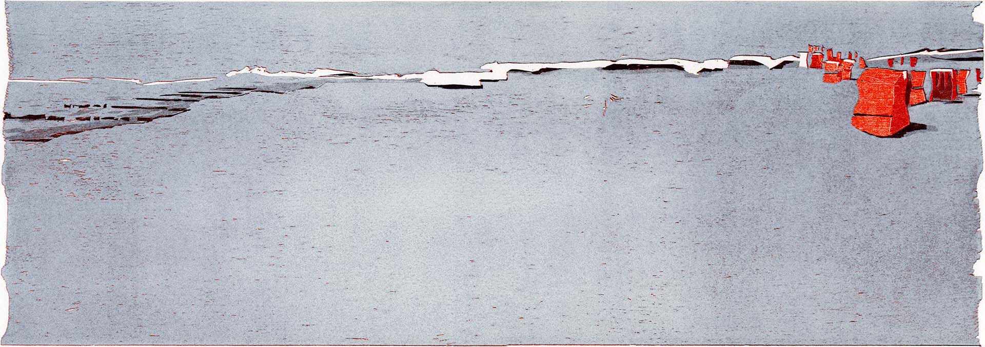 Wellenbrecher im Wattenmeer · 2021 · Farbholzschnitt auf Büttenpapier · 21 × 60 cm