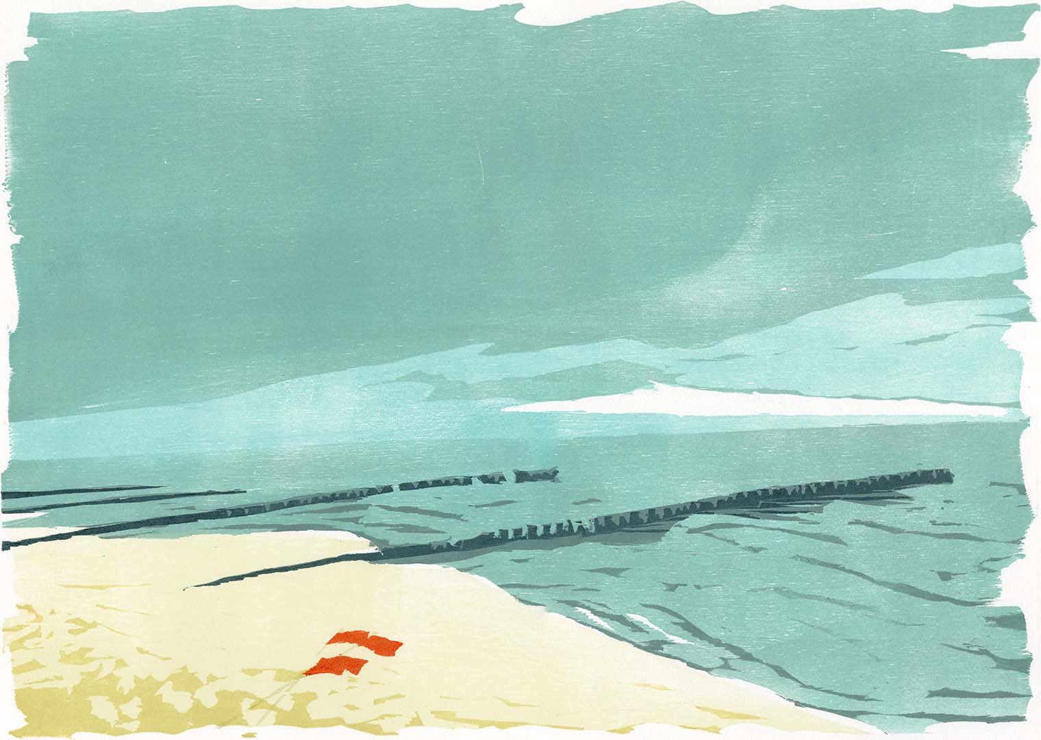 Buhnen am Strand · 2014 · Farbholzschnitt · 42 × 60 cm